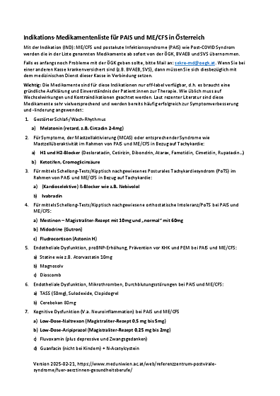 Indikations-Medikamentenliste für PAIS und ME/CFS in Österreich